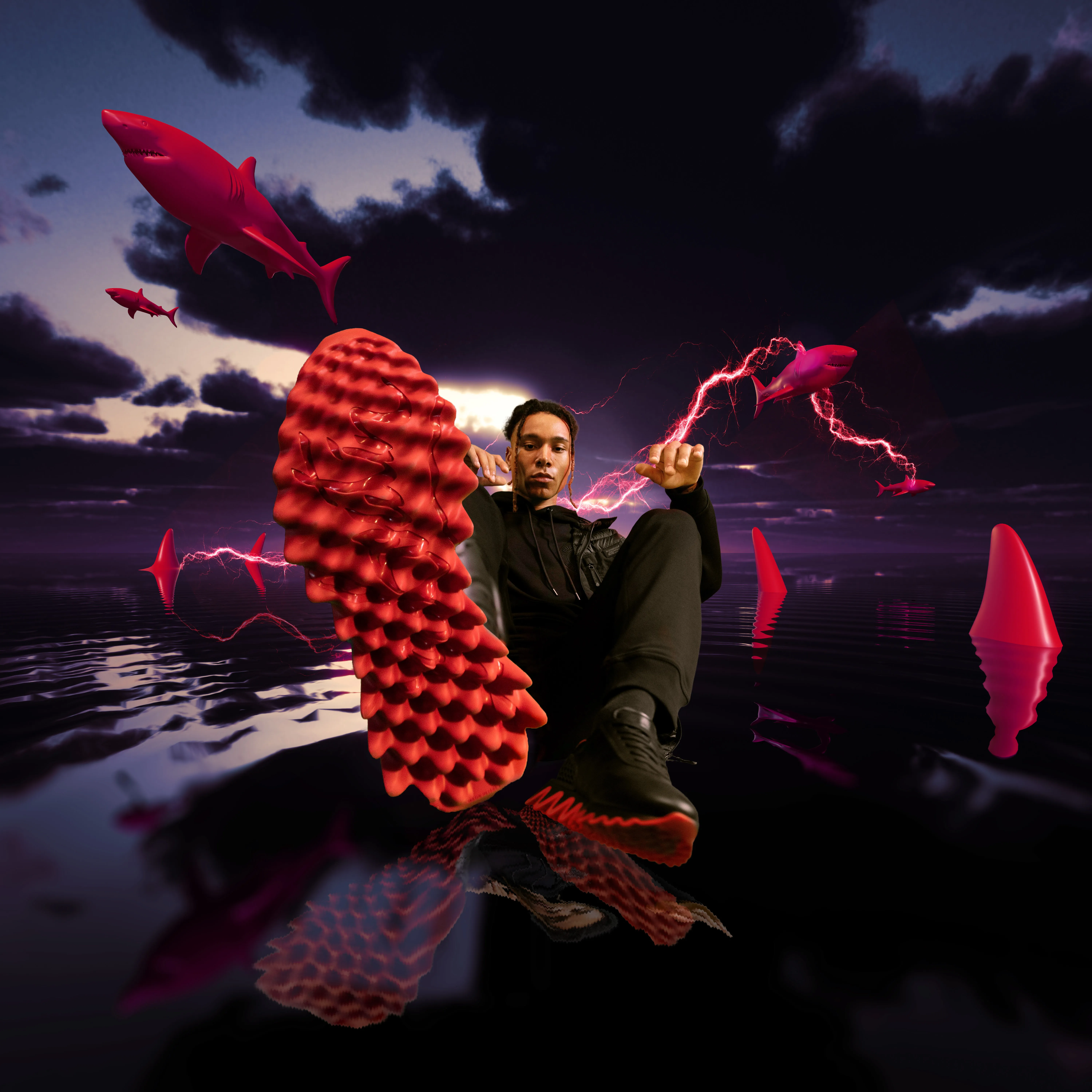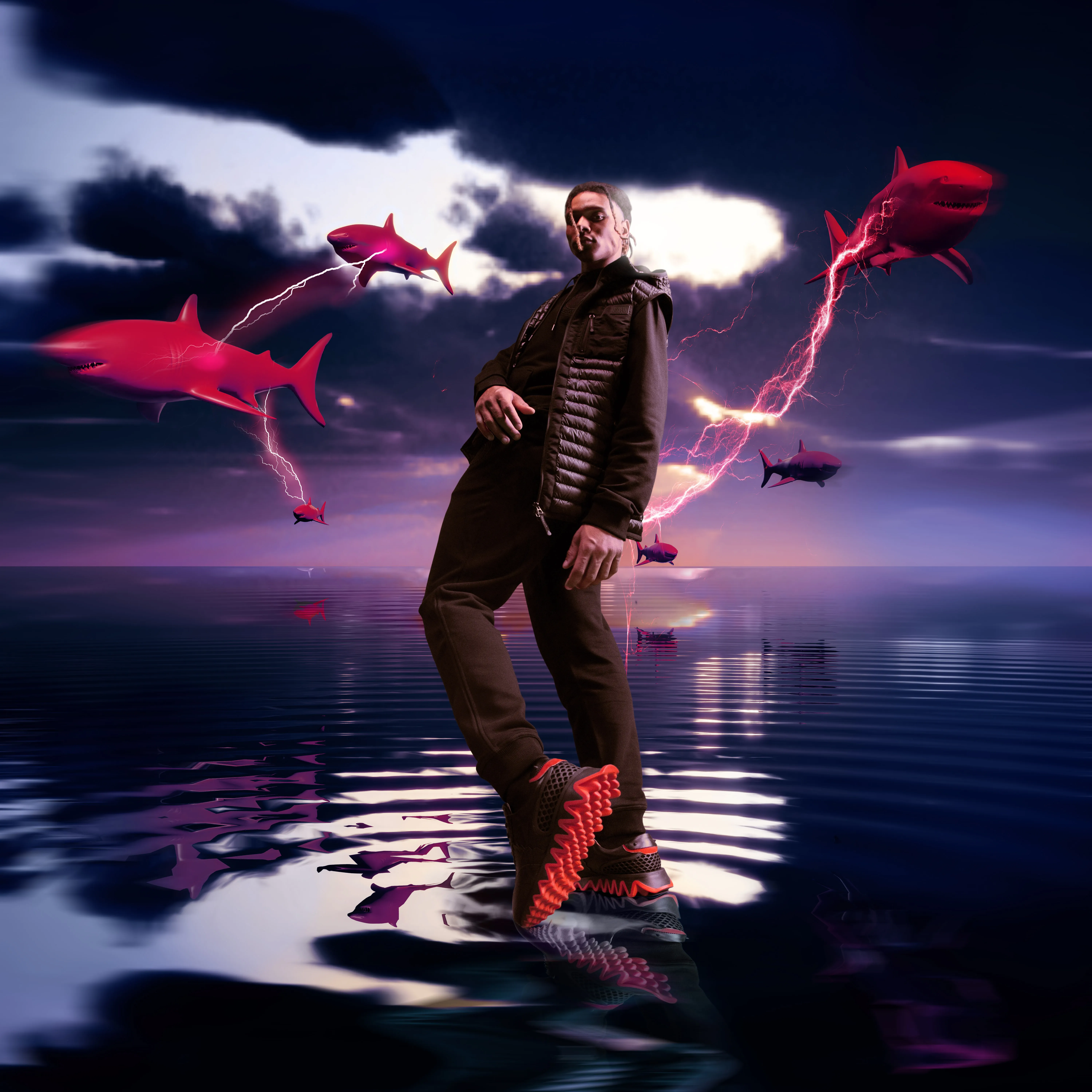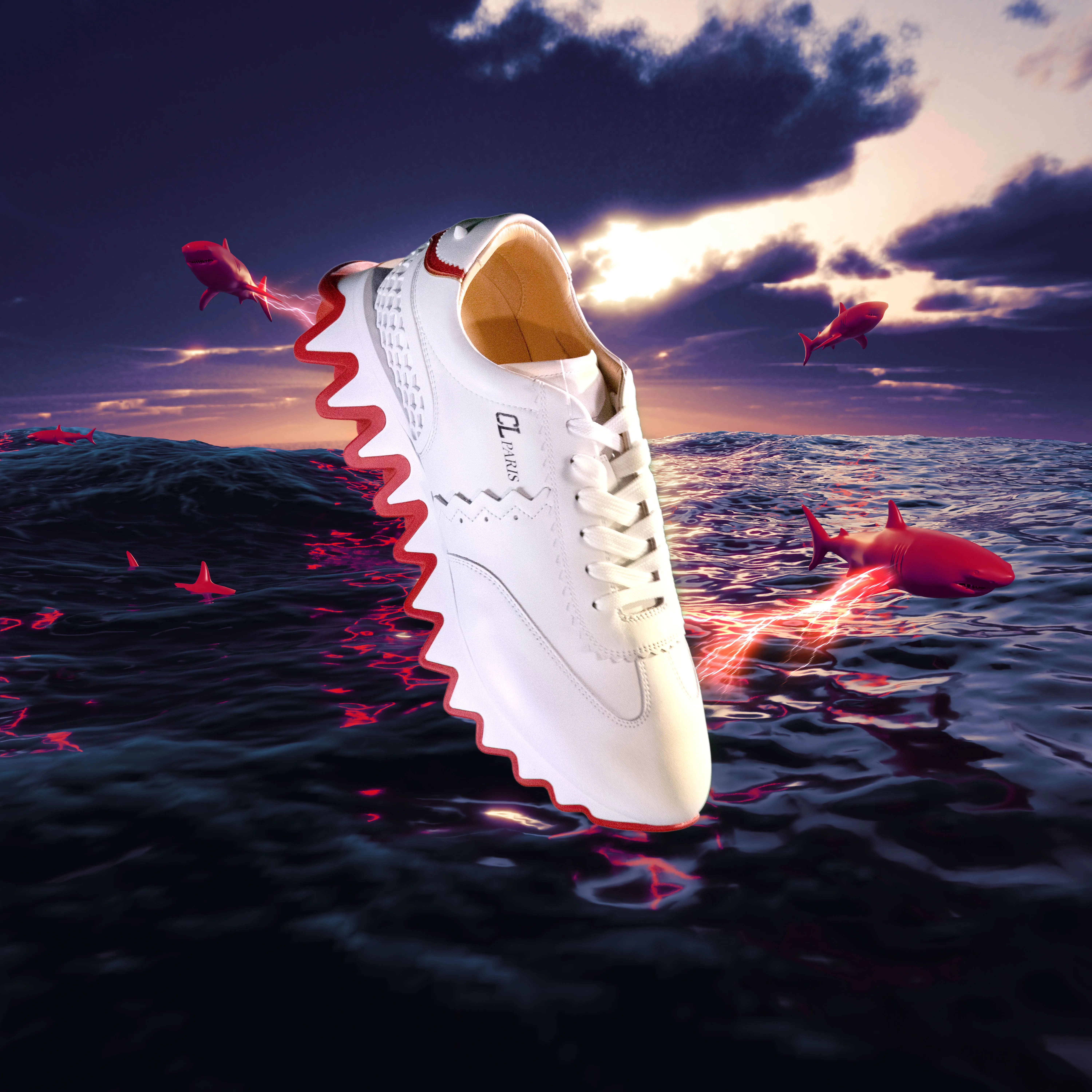 A set of visuals I created for Christian Louboutin’s “Loubishark” sneaker launching at British retail giant- Flannels, which features a vibrant jagged sole inspired by shark teeth. I pitched the concept centred around the sharks’ “electroreception”, a unique sense that sharks possess that helps them sense the bio-electricity of their prey in the water. The visuals feature a range of different visual scenarios, mimicking a tv switching channels. My SOS team and I used a huge range of visual techniques in this project, elaborate set design, graphic art, projection mapping, CGI and compositing, photography, video and much more.